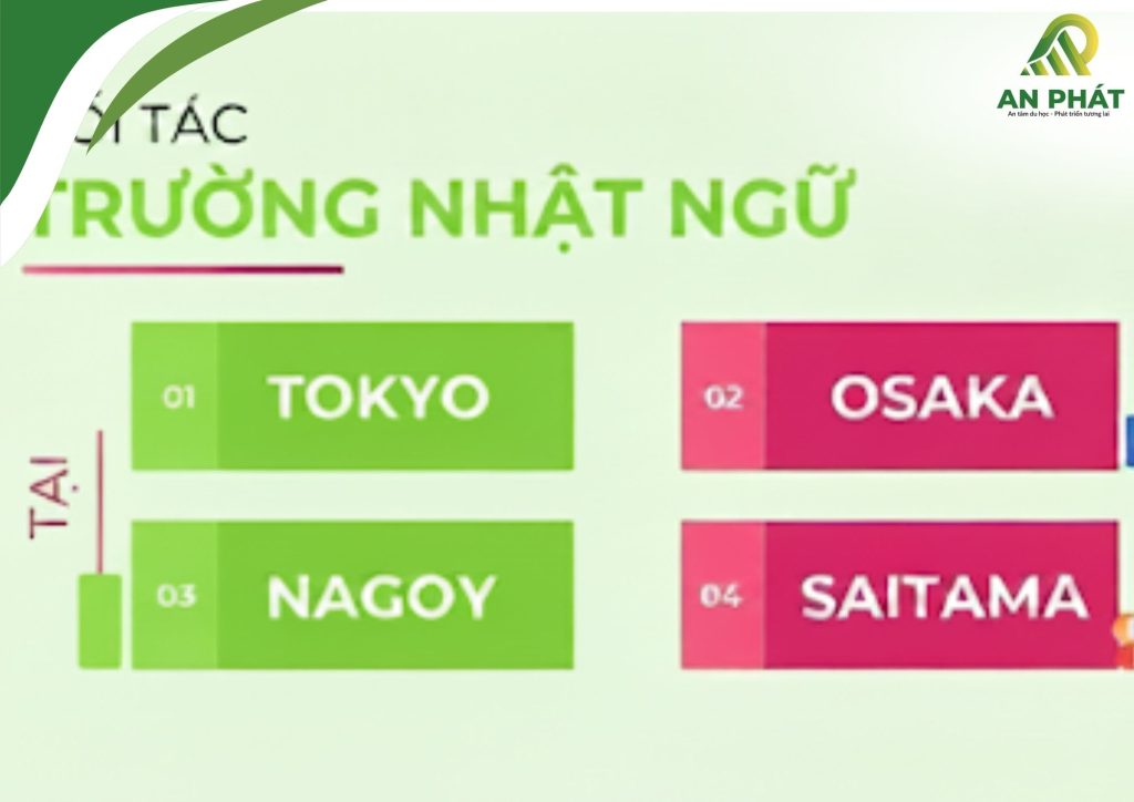 Du học An Phát tự hào là đối tác của các trường Nhật ngữ hàng đầu tại các thành phố lớn như Tokyo, Osaka, Nagoya, và Saitama. Chúng tôi cung cấp thông tin chi tiết về chương trình học, học phí, và môi trường học tập để bạn có thể lựa chọn phù hợp.
